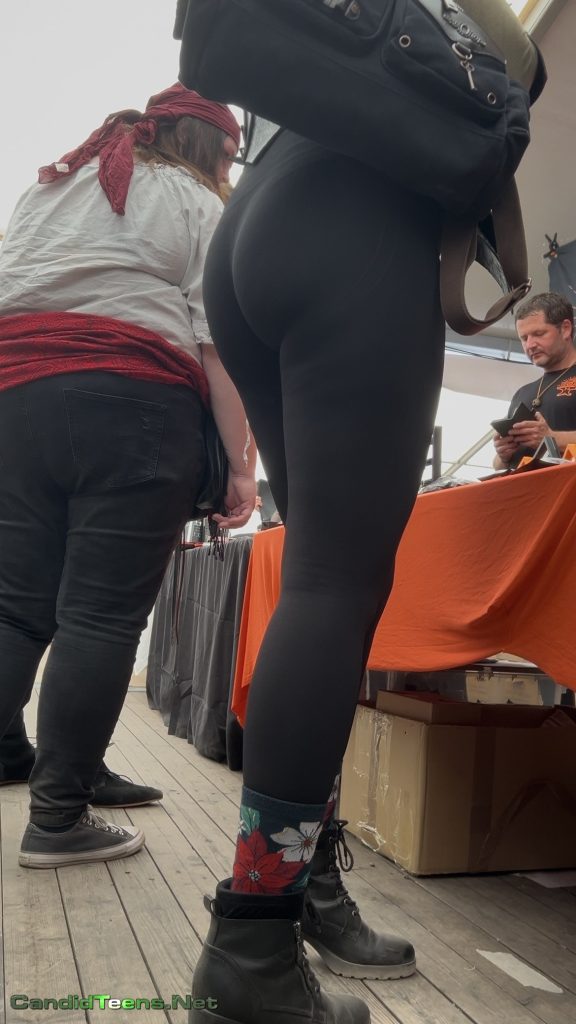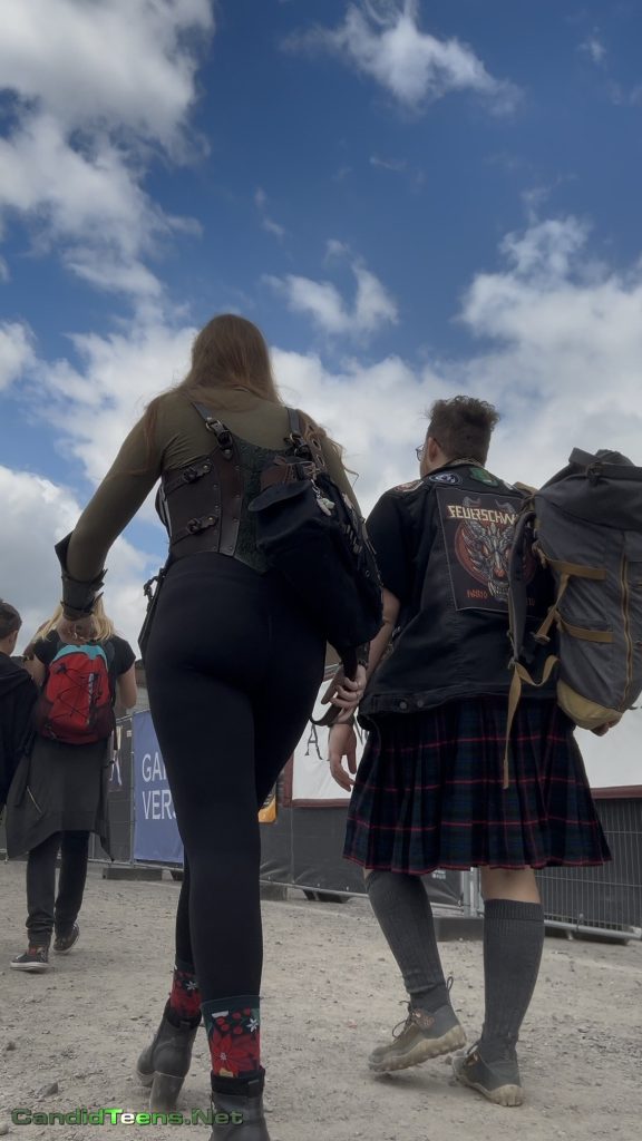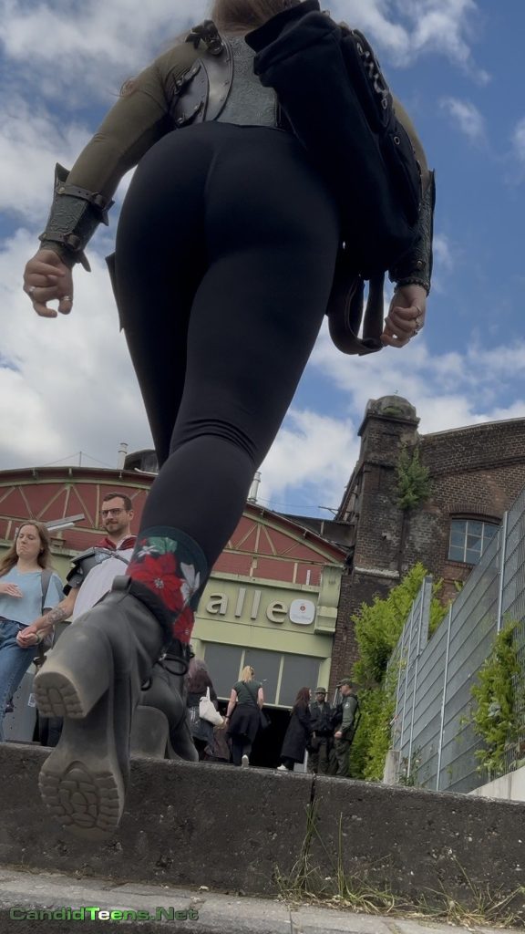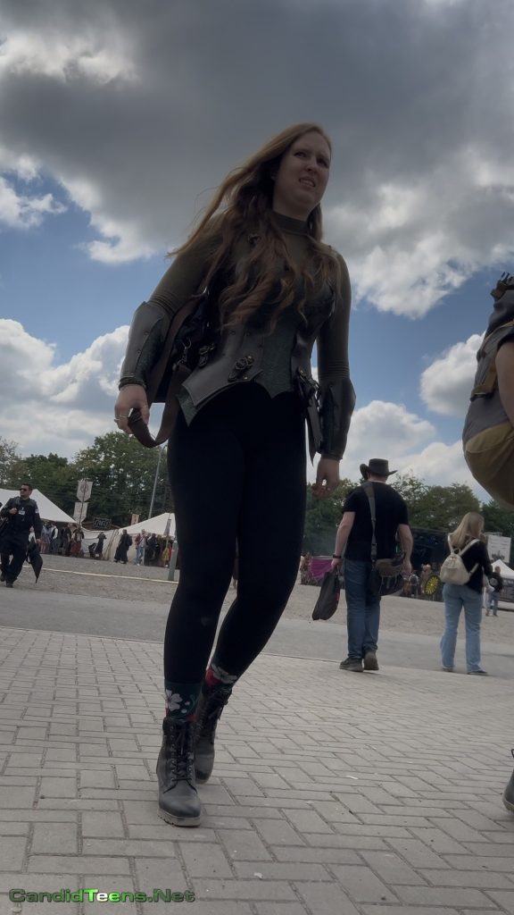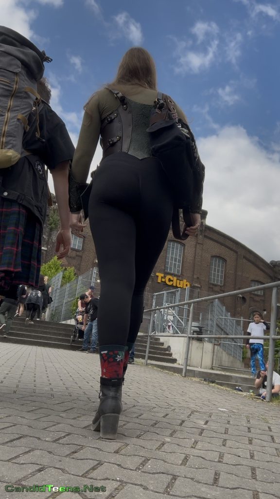 Out at some epic outdoor market/fest, this tall blonde with the long hair and killer figure turns heads without even trying. Those matte black leggings are painted on, showing off her thick, peachy ass as she struts past vendors and crowds. Love the contrast with her earthy corset harness, big backpack, and those adorable flowery socks tucked into combat boots – total fantasy warrior babe energy. Every step makes her cheeks bounce just enough to drive you wild. Sneaky candid gold from the side and rear angles. Can’t look away… who else is saving this loop? 🍑💚 #candidteens #assinleggings #steampunkgirl #voyeurvibes.
