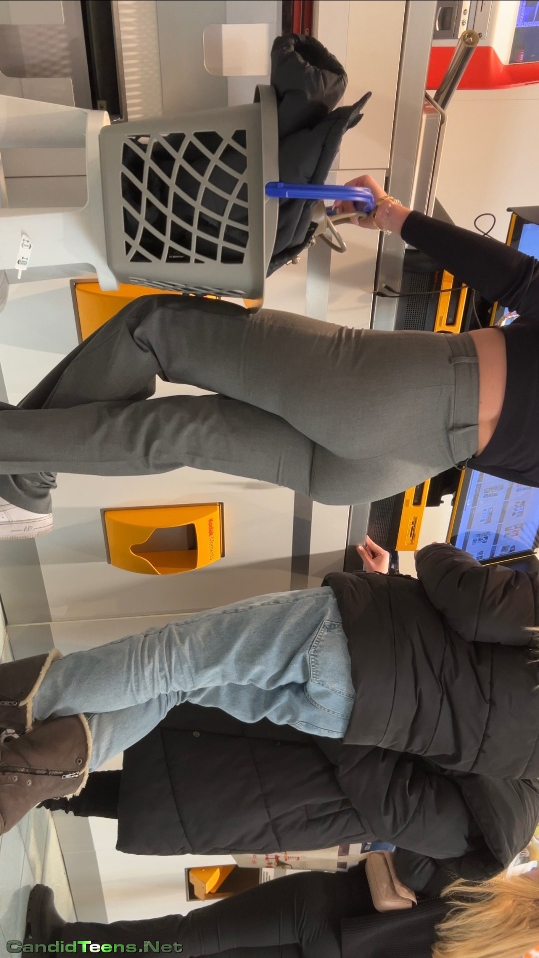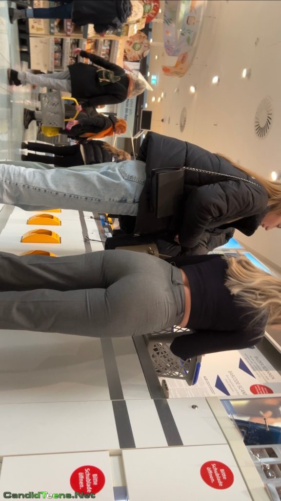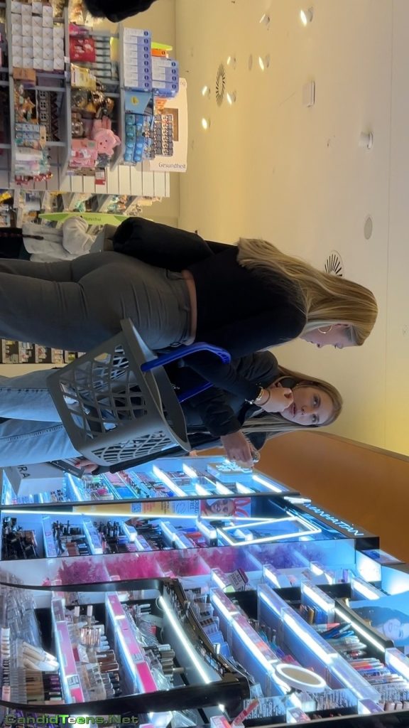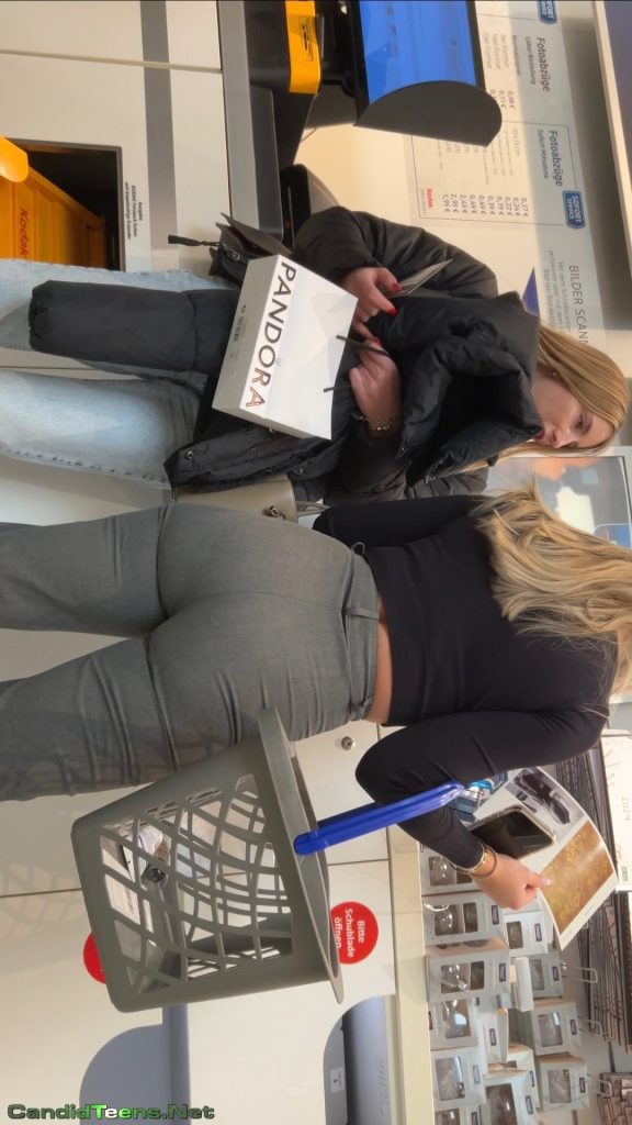Super hot blonde girls with tight ass in tight grey pants shopping together at store caught on creepshot cam.