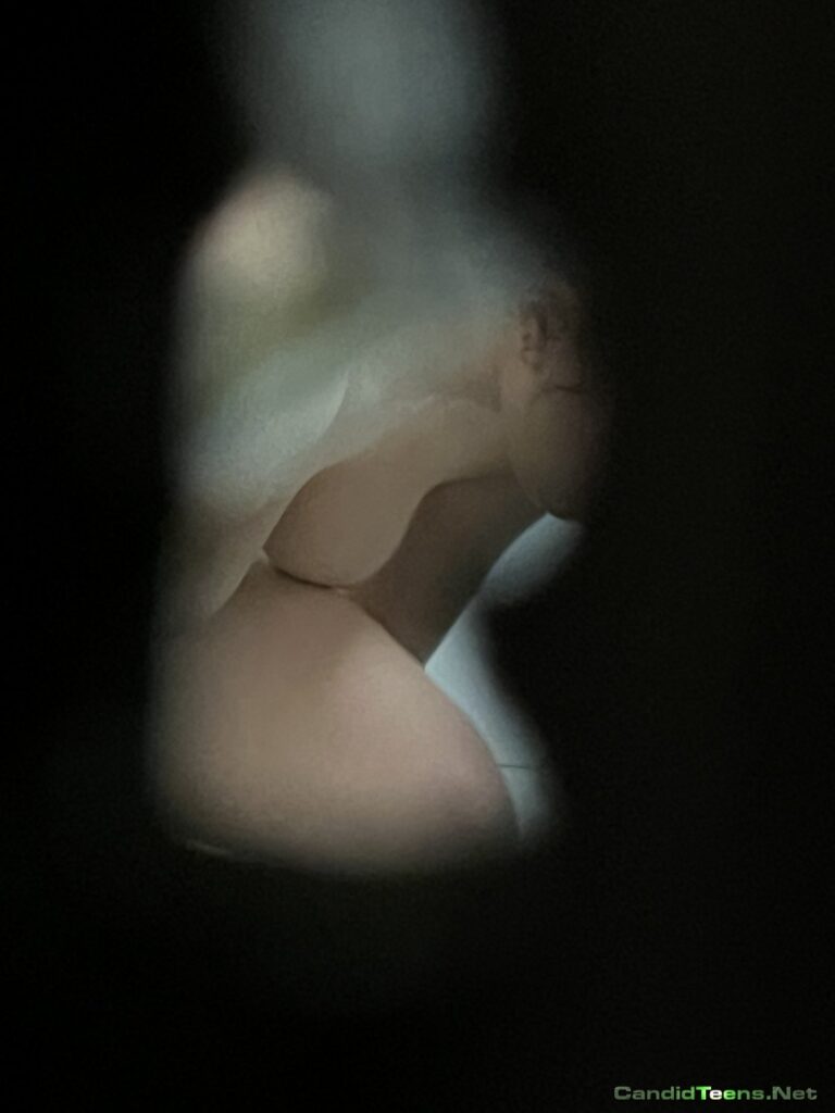 Hot big tits stepsis in bathroom with huge tits and shaved pussy caught on hidden cam.