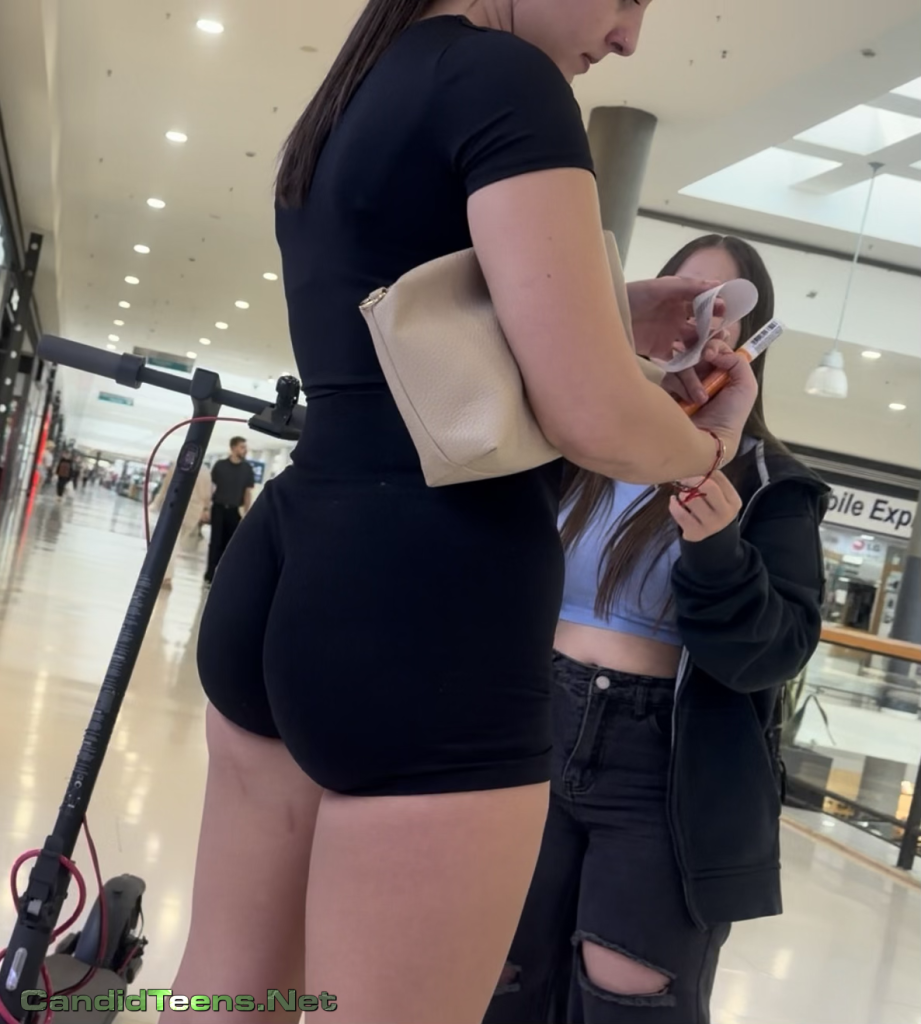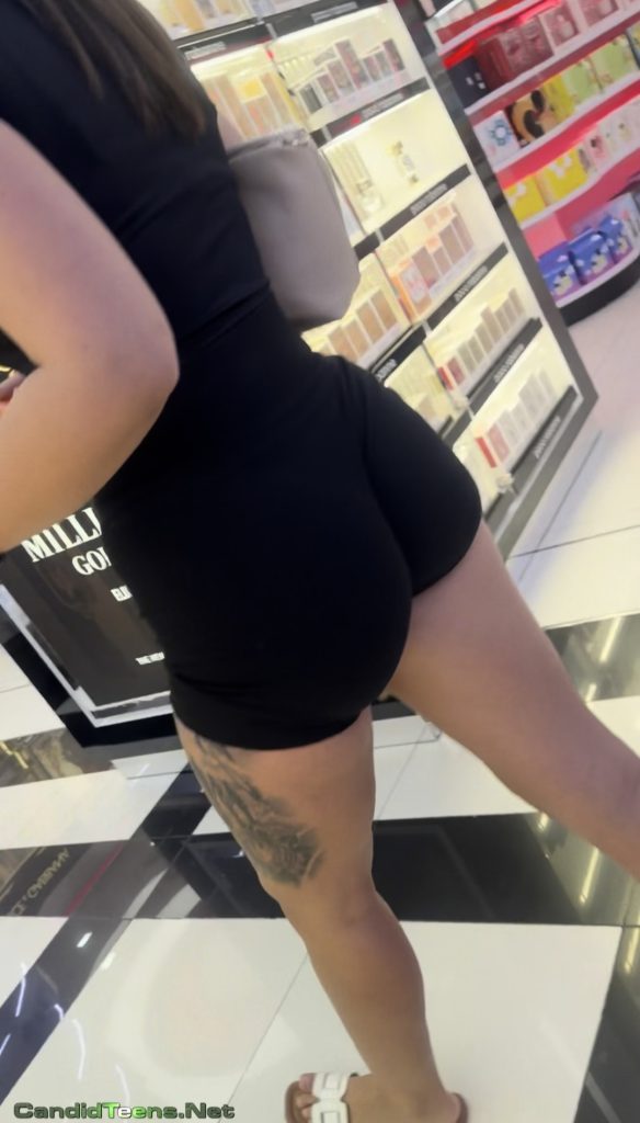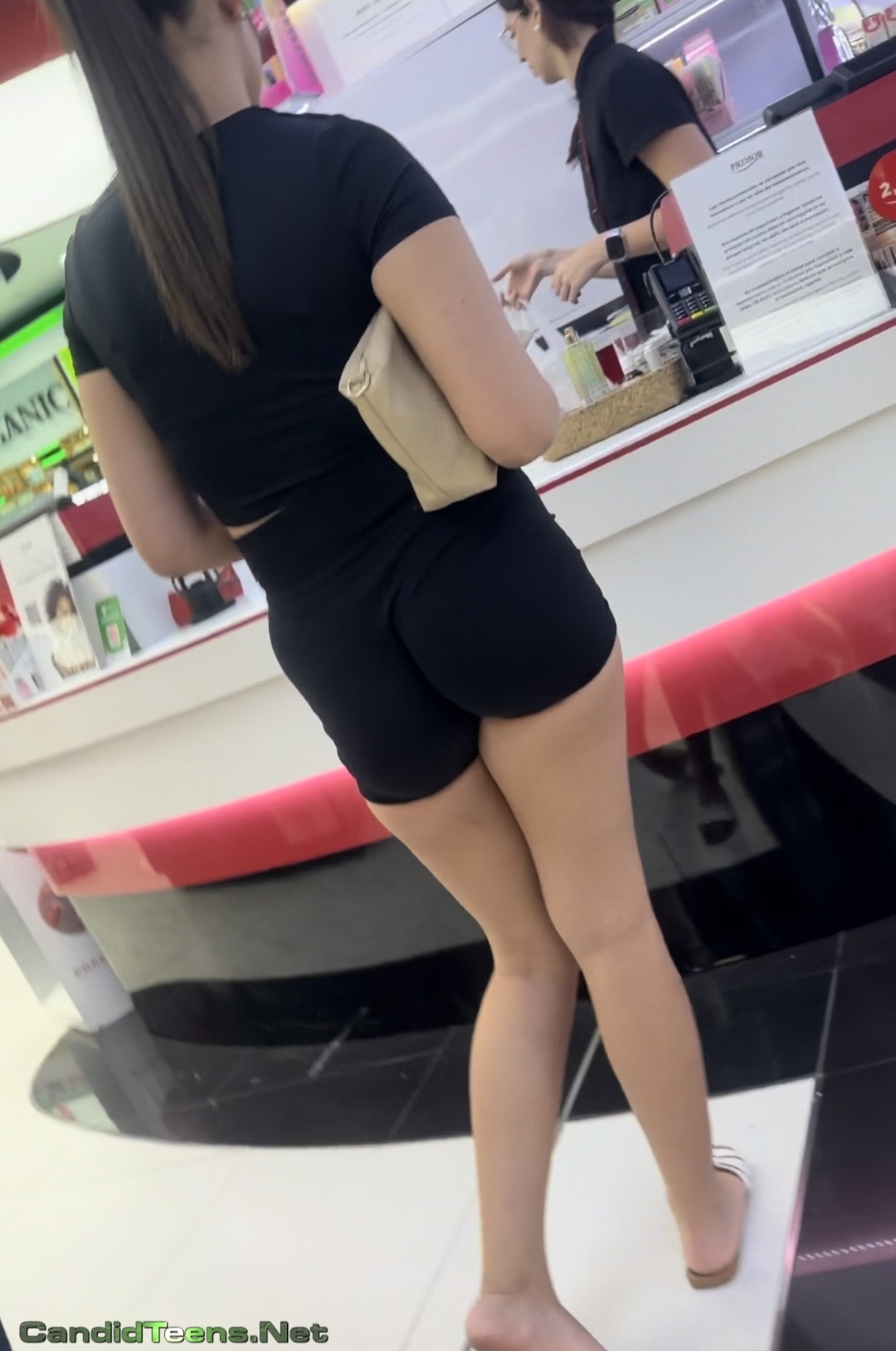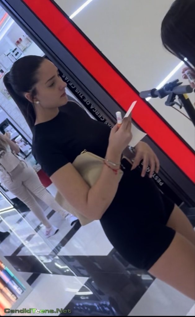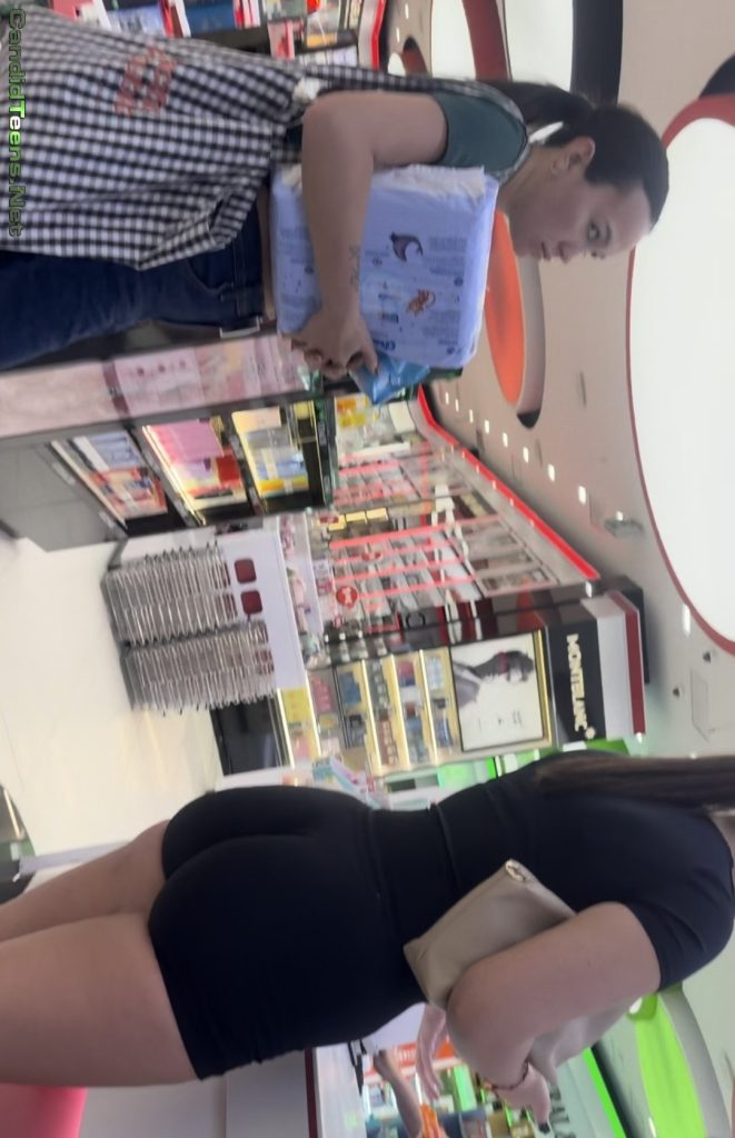 College Hot girl tight bubble buttocks in tight shorts at makeup shop sexy candid video.